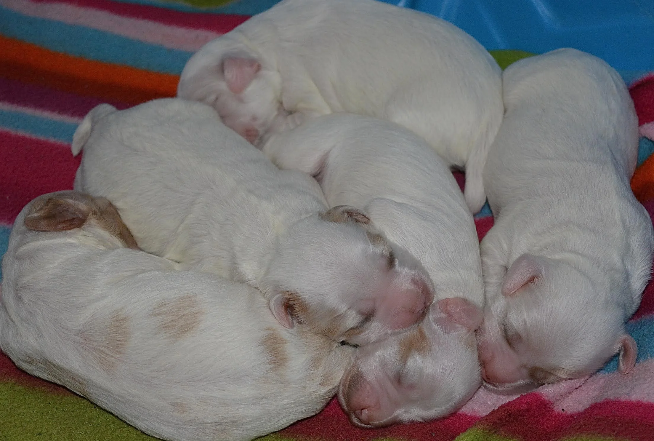 Tasha & Panda Bear became proud parents to five apricot parti babies last Sunday! Tasha is an experienced mama and loves her sweet family. The puppies markings are showing more and more each day and they will be much like their lovely mama. Next week their eyes will be opening and they will be getting more and more mobile. Lots of interesting and wonderful changes each and every day.